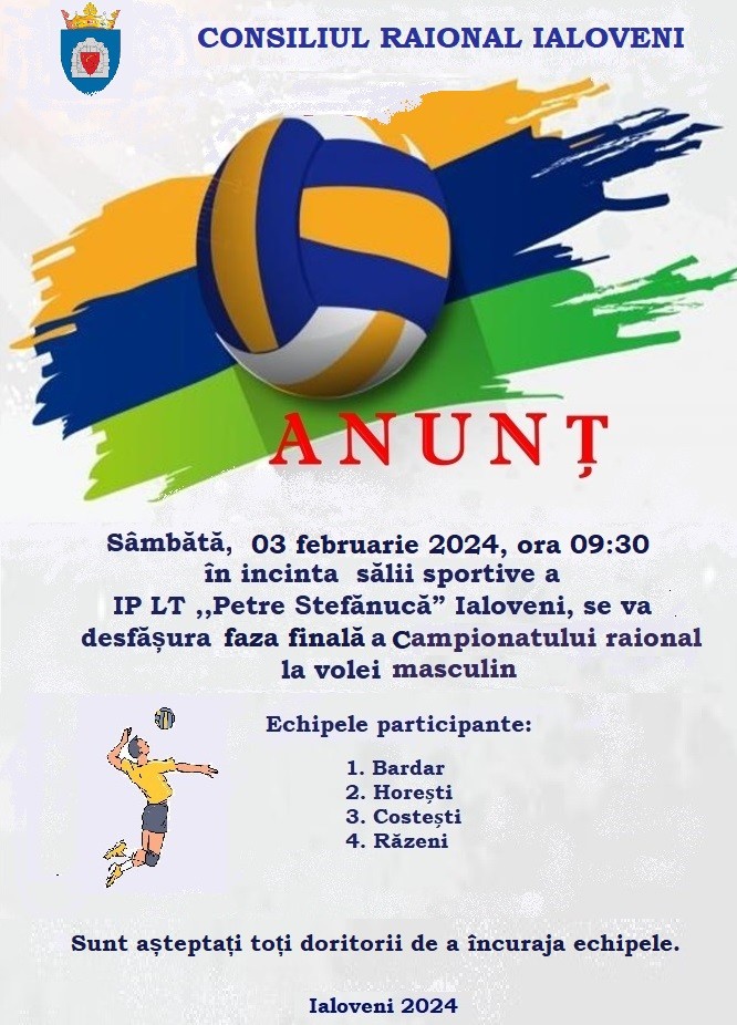 Competiția sportivă va avea loc în sala de sport a Liceului Teoretic „Petre Ștefănucă” din orașul Ialoveni, sâmbătă, 03 februarie 2024, cu începere de la ora 09:30.