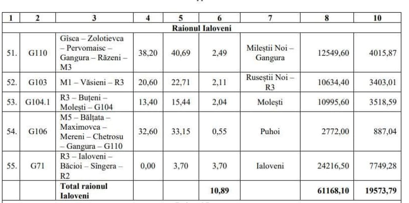 Suma totală planificată a investiției pentru reabilitarea celor cinci drumuri regionale din raionul Ialoveni constituie 19 573,79 mii lei.