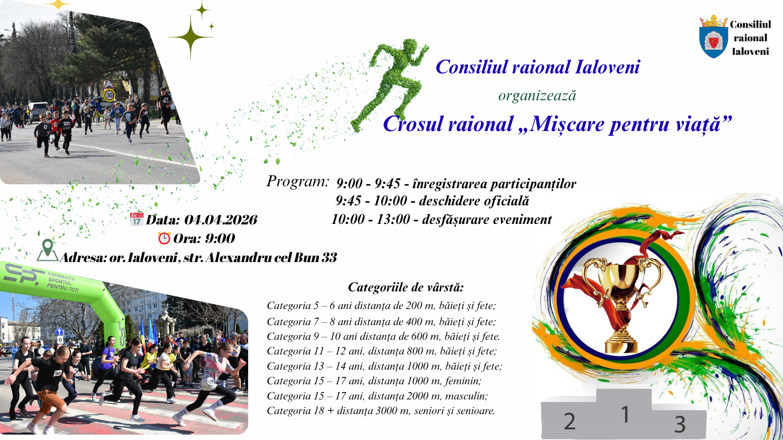 Consiliul raional Ialoveni invită toți doritorii să participe sâmbătă, 4 aprilie, cu începere de la ora 9:00, la crosul raional „Mișcare pentru Viață”, competiție destinată atât adulților, cât și copiilor.