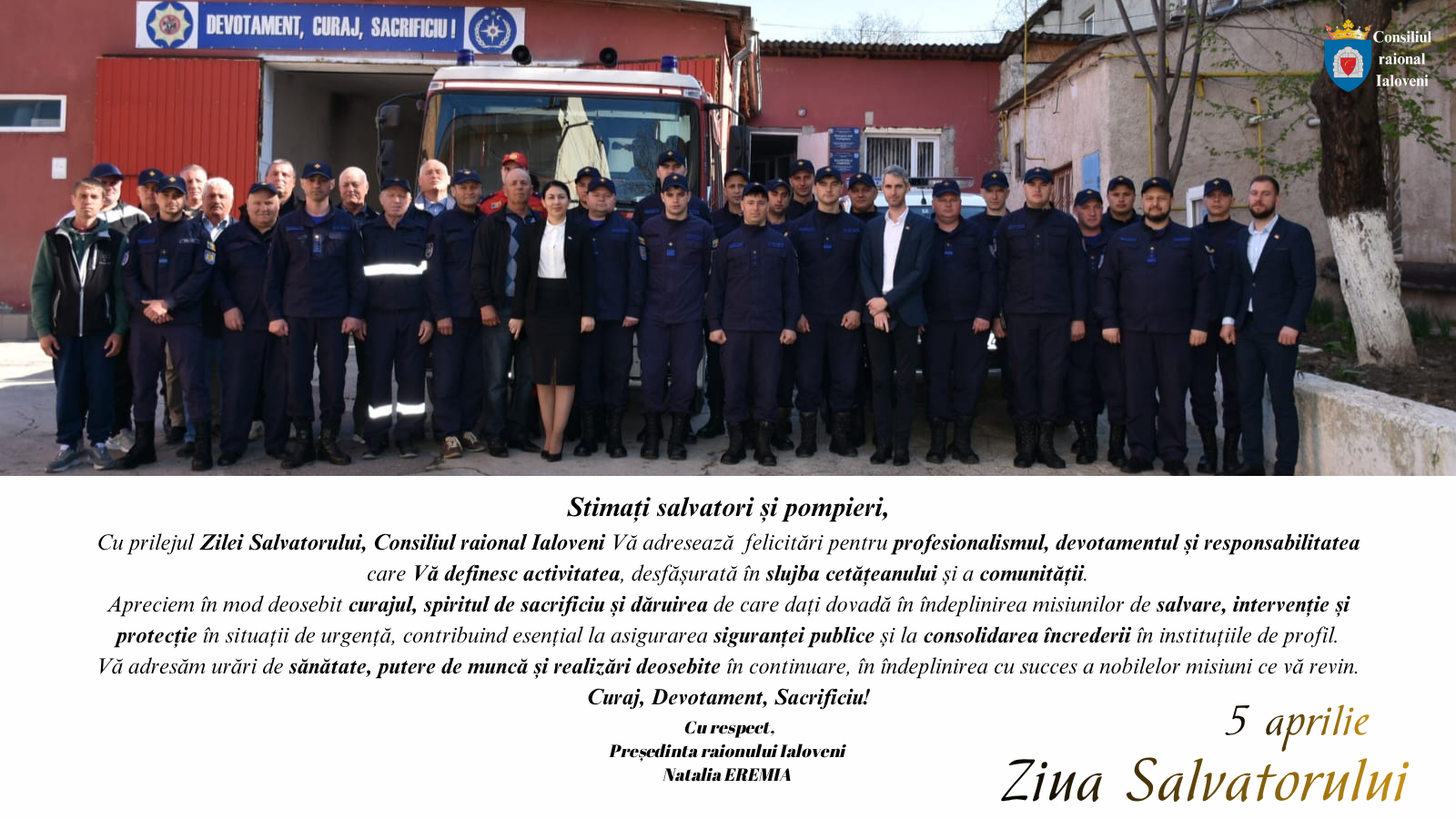 Cu prilejul Zilei Salvatorului, Consiliul raional Ialoveni Vă adresează felicitări pentru profesionalismul, devotamentul și responsabilitatea care Vă definesc activitatea, desfășurată în slujba cetățeanului și a comunității.